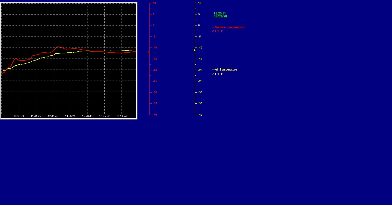 ![]() Home Past Seasons Monthly Stats Past Seasons of note Snowfall stats Daily Climate Weather Underground Dashboard Air Versus Surface Temperature Graph The weather information is presented using Meteobridge and Weather Display software. The weather reports are for information only and not to be used for official purposes. |